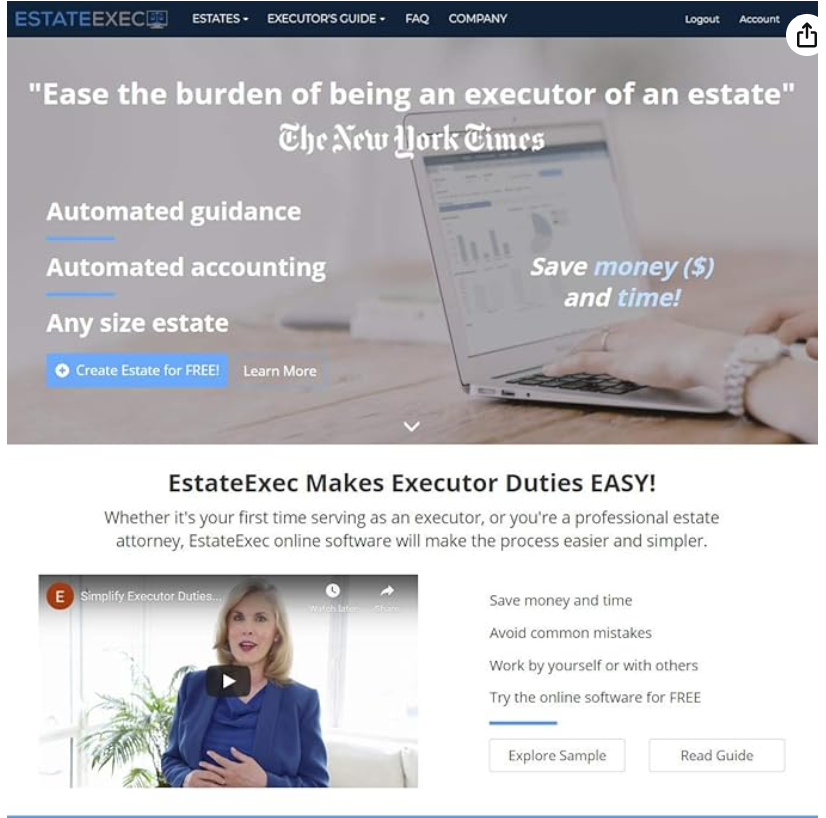 EstateExec is an online software platform that provides step-by-step guidance for executors of a will. It helps manage everything from tracking assets and liabilities to generating required legal documents. Instead of spending hours trying to interpret probate laws or paying thousands to attorneys, executors can confidently navigate the process with the help of EstateExec.